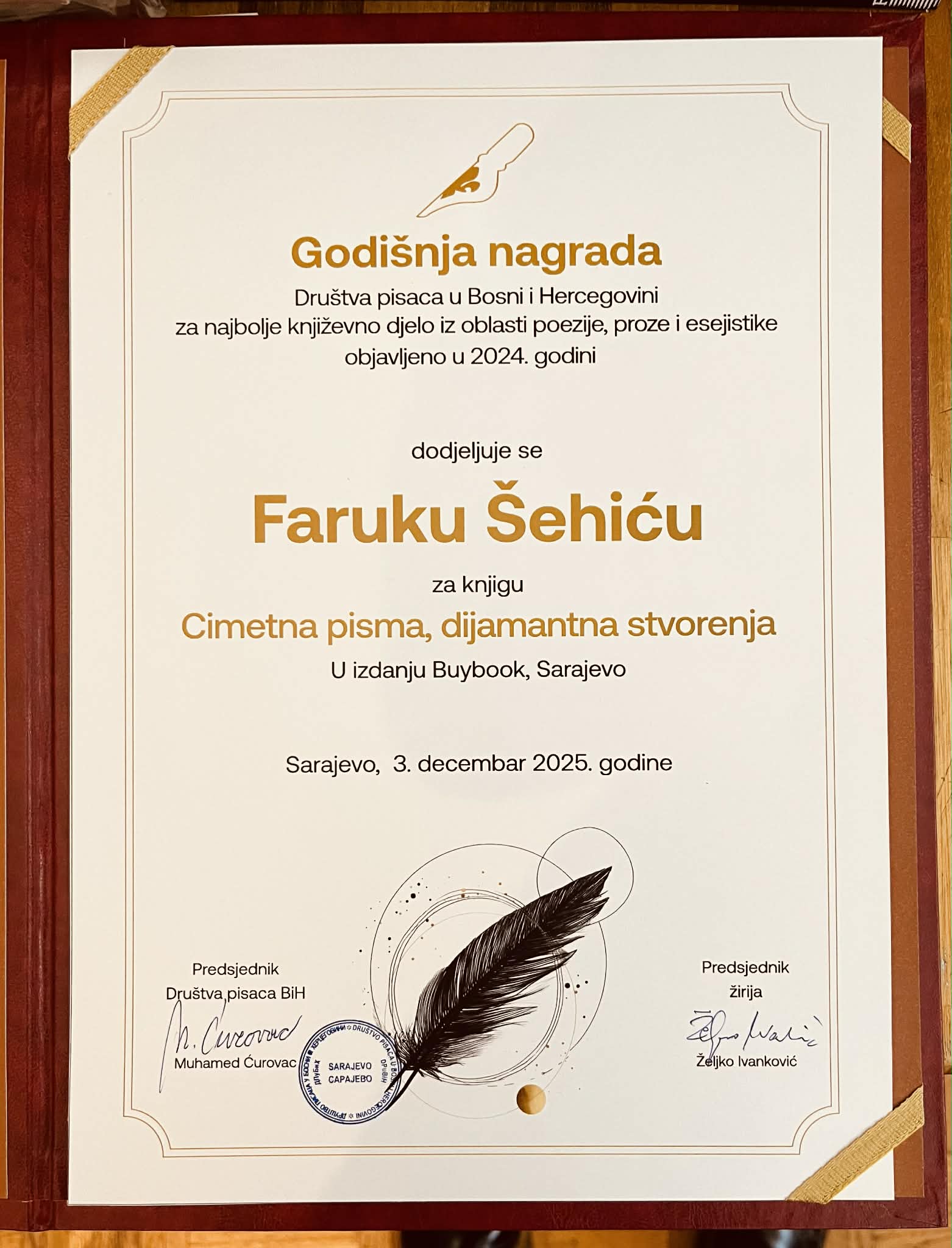 “Dobitnik Godišnje nagrade Društva pisaca u BiH za 2024. godinu je Faruk Šehić za roman ‘Cimetna pisma, dijamantna stvorenja’, u izdanju Buybooka.